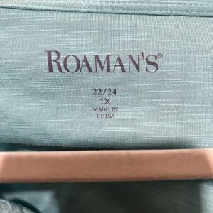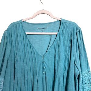 Roamans Top Womens 22 24 1X Blue Pintucked Lace Hem V Neck Stretch Blouse Ladies