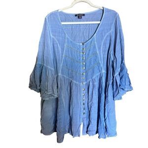 Roamans Top Womens 26W Blue Eyelet Mixed Media Boho Flutter Button Detail Blouse