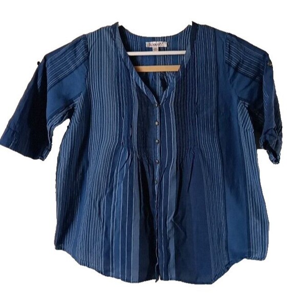 Roaman's Woman's Shirt 18W Blue Gradient Striped Pleated V-Neck Button Up Boho