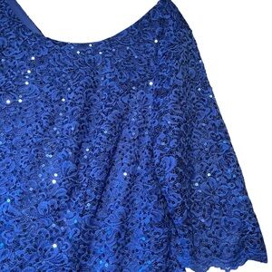 Chic blue maxi dress with a sparkling overlay. Perfect for evening events.