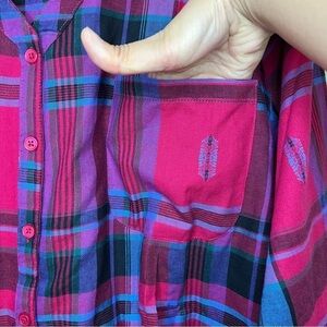 Roaman's Women's Button Up Shirt Tunic Plaid Roll Tab V Neck Size 22 Rainbow