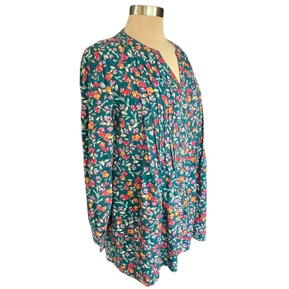 Roaman's Womens Dark Dainty Floral Button Up Tunic Sz 14W Roll Tab Sleeve Pleats. 100% cotton. Split neckline. Delicate pleats at top front bodice. Gorgeous fall colors.