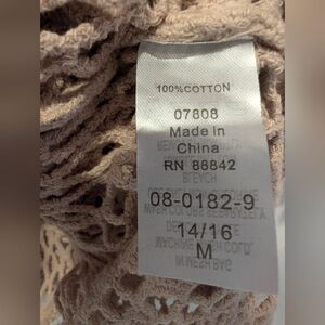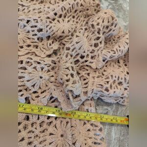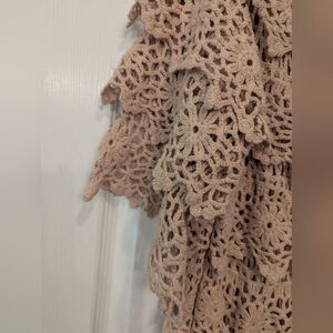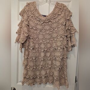 Roamans Womens beige neutral Plus Size 14/16 Tiered Crochet Sweater Short Sleeve Boho Shirt. This elegant crochet lace top features a beautiful tan color, perfect for any occasion. Its intricate design adds a touch of sophistication to your wardrobe. Great condition. feminine in this top, featuring a scoopneck and elbow-length sleeves. Wear it with your favorite cami or tank.