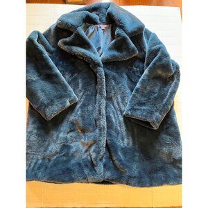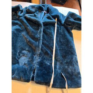 This elegant faux fur coat by Roaman's is crafted for warmth and sophistication. The dark blue/green hue is both striking and versatile, suitable for various settings. The coat features a soft polyester lining for comfort and ease of wear. Ideal for formal or casual occasions, offering timeless style and functionality. Three snaps to close down the center front. excellent preowned condition, no rips holes or stains. See photos approximate measurements. Feminine, chic, elegant.