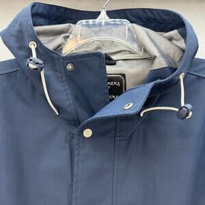 Roamers and Seekers Men's rain jacker. Navy blue in color. Tagged size large. Water-resistant polyester shell offers weather protection. Bonded mesh lining enhances breathability allowing for better layering. Oversized front pockets offer both side and top entry. Hood with bungee drawcord adjustability.