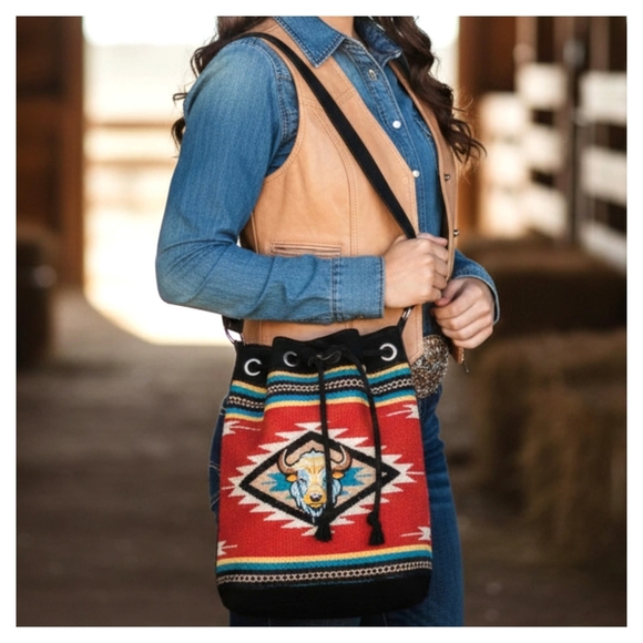 Handwoven Cotton panels with genuine suede trim and adjustable handle. Has a cotton cord cinch closure at top.