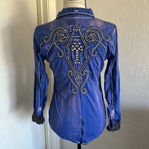 Roar Ari ll Blue With Pink Hues Heavily Distressed Embroidered Embellished Shirt, size medium. Button closure, view all photos for best representation, in great pre loved condition.