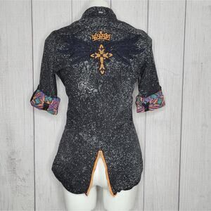 Roar Embellished Embroidered Studded Button Down Shirt, size Large