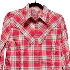 Roar Pearl Snap Embroidered Pink Plaid Long Sleeve Rockabilly Womens Shirt Sz XL
