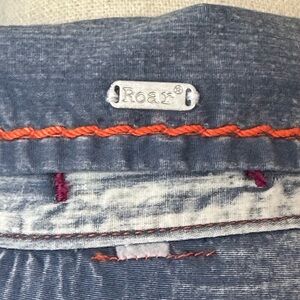 Nice preowned condition, no flaws to note. Distressed look with colorful embroidery, large center back cross. Cotton blend. Two front pockets.