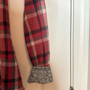 Great condition! Roar Plaid Button Down Western Shirt with Pearl Snap Buttons. Ladies Size Small. Gorgeous embroidery & hand set rhinestone studs. Floral neckline & flip wrist cuffs with convertible sleeve strap. Tapered bottom with 7” zipper at bottom of back. 100% cotton in shades of red, pink, gray, black and white. From non-smoking home.