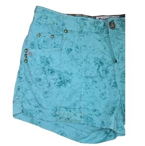 Turquoise color shorts with distressing on back with sequins in the distressing. They have a tie dye look but with same coloring. Short inseam.