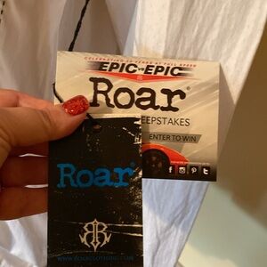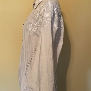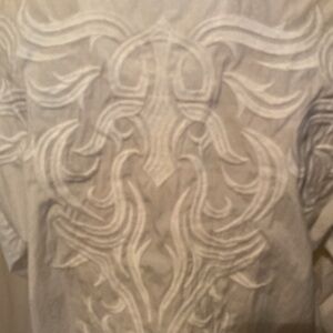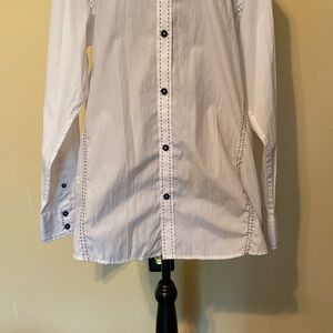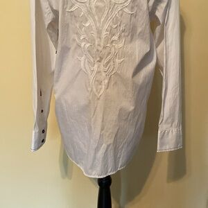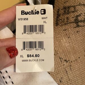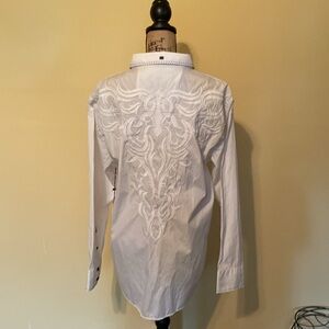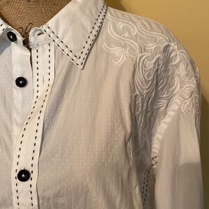 Men’s Roar button down, lightweight cotton/polyester blend, white with embroidery on shoulders and back, black buttons and some black stitching, from Buckle