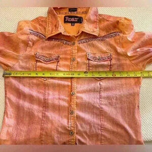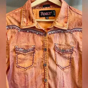 Roar signature stretch XL Western Rodeo Rhinestone embellished long sleeve Button Down shirt. Lots of great details to this lightweight pretty top