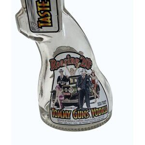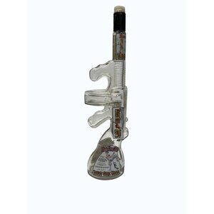 This unique Roaring 20's Tommy Guns Vodka bottle is an eye-catching piece for collectors. The bottle is shaped like a Tommy Gun and encapsulates the essence of the roaring 20s era, featuring vibrant graphics along its surface. 19" long