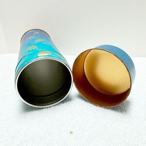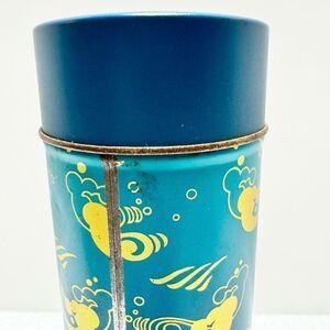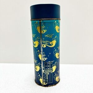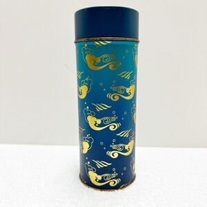 Beautiful Nori seaweed tin from Japan. Design is an ombré blue with gold accents. Very good condition with some rusting on rim of lid and base. Roughly 8.5” tall by 3” in diameter.