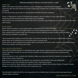 Natural rock salts scented with fragrance oils, enhanced by a touch of beautiful color, biodegradable sparkles and mica to create fragrant salt crystal potpourri for your warmer. May also be used in a sachet, glass or metal non-food container as potpourri. Packed in a resealable holographic bag to pour directly into warmer dish.
