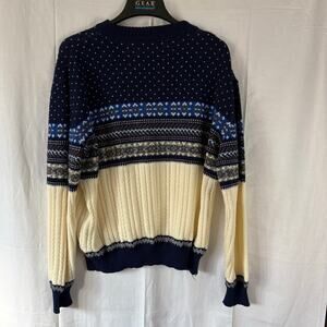 Cozy up in this classic Rob Winter Sweater! This adult size XL sweater features a beautiful blue knit with a timeless Fair Isle Nordic geometric pattern, perfect for a grandpa-chic look. It's in good used condition and ready to keep you warm all season long!