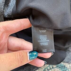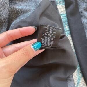 This is a stylish and modern jacket by Robbi & Nikki. It features a unique asymmetrical zip closure and a contrasting gray and black color scheme. The jacket has a tailored fit and is perfect for a business casual or evening look.