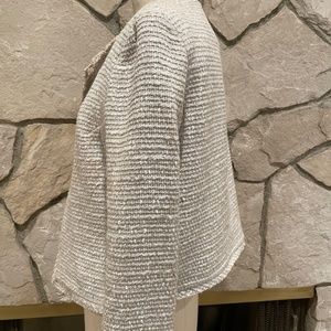 Contemporary beige and white tweed jacket. This boxy style is perfect over a white tee. The unfinished edging and orange lining gives the modern twist to this classic style.