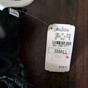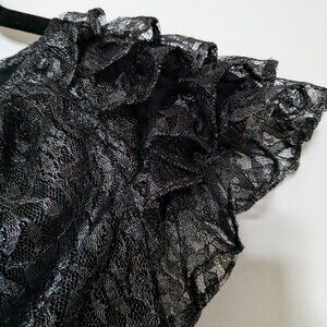 Robbi and Nikki sleeveless metallic shirt. Fully lined. Shell 100% polyester. Lining 97% polyester and 3% spandex. Pit to pit 19". Back top to hem 22.5". Lacey shell. Color silvery black.