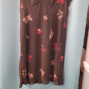 This beautiful Robbie Bee dress (Size 12) features a classic black background with an allover white polka dot print and charming floral accents in red, cream, and soft brown. The dress has a flattering v-neckline with a gathered bust detail, cap sleeves, and a gently elasticized waist for a comfortable, feminine silhouette.
