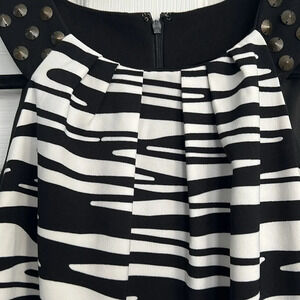 Get ready to make a bold statement with this black and white zebra print dress! With its eye-catching design, this dress is perfect for those who want to stand out from the crowd. The dress features studs around the collar, adding a touch of edginess to the overall look. It also has a convenient zip closure at the back, along with a hook and eye closure for added security. Preloved.