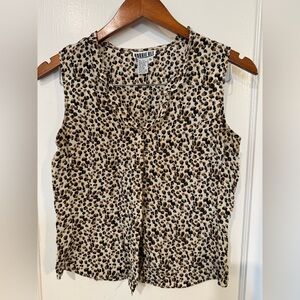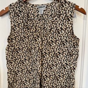 This elegant Robbie Bee blouse features a sleeveless design with a charming peter pan collar, perfect for warm weather. The blouse showcases a sophisticated brown and tan color palette, adding a touch of class to any outfit. Its buttoned style offers a timeless appeal, making it a versatile addition to your wardrobe. Bin 6 item 35.
