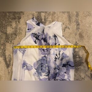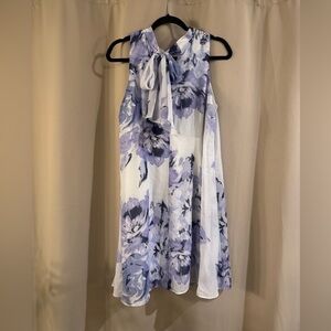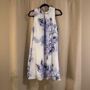 Chic dress with a stylish floral design. Features a blend of purple and white hues.