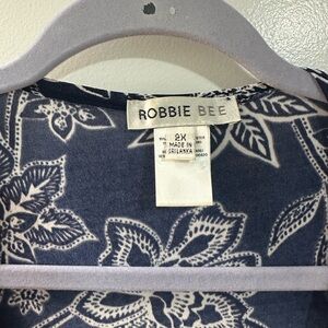 Chic navy dress with white floral pattern. Features a flattering twist front. Perfect for any occasion.