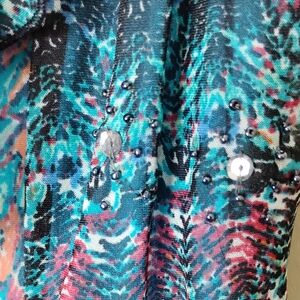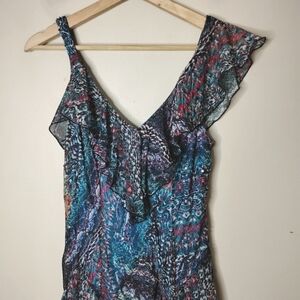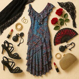 Statement ruffle-tiered chiffon maxi in a moody mosaic print (teal/magenta/black). V-neck with frill & tie, asymmetric cascading hem, floaty movement—perfect for parties, date night, or witchy-boho events.