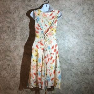 This unique sleeveless summer floral dress has a cluster of ruffles that goes down the front of the dress and spans out across the entire hem. In the back it leaves making a braided look which makes the dress hug the figure. It’s lightweight and has very little stretch. The fabric of the body and the liner is 100% polyester. It is machine washable in cold water and line dry. It’s new without tags and in excellent condition. Offers are welcomed.