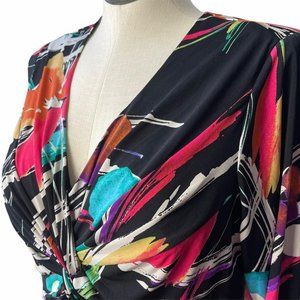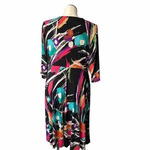 Signature by Robbie Bee Twist Front Dress, 2X. Black base and multi color abstract floral. 95% poly, 5% spandex. P2P -22", L - 41" Very gently preowned.