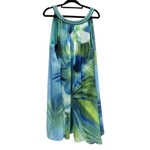 A flowing halter dress showcasing a water colored tropical floral print. The piece features a beaded neckline and tie-back design, offering an elegant and breezy look. Size 12 New with tags. Made from polyester and spandex.