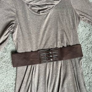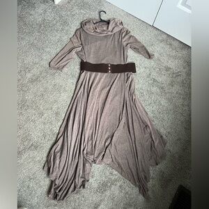 Chic taupe dress with a high low hem. Features a stylish cowl neck and matching belt. Perfect for versatile wear.