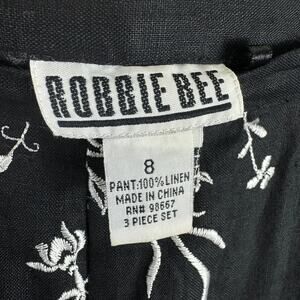 Robbie Bee Vintage Black Linen Elastic Pants White Floral Embroidery Size 8