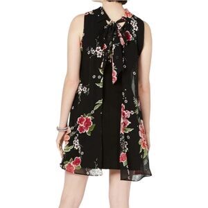 Expect compliments in this Robbie Bee dress designed with a fluttering embroidered overlay and tie neck.