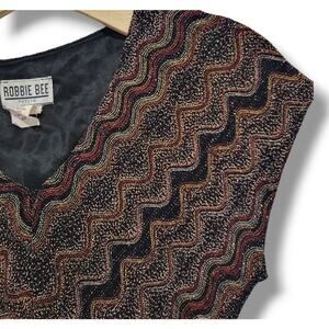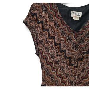 Chic Robbie Bee petite bodycon dress in rich brown tones with metallic texture. Vintage-inspired style, short length (37”), polyester metallic blend. Size 4P, pre-owned & in great condition. Perfect for parties or evening wear!
