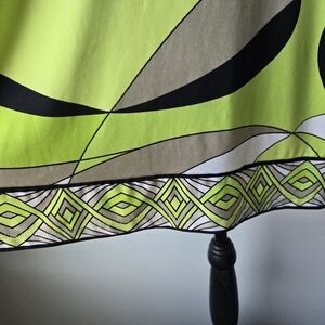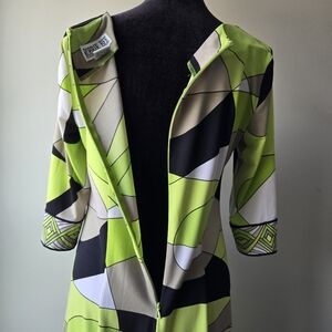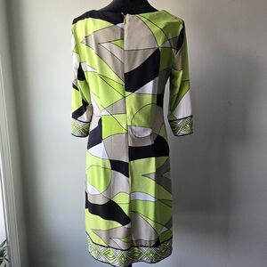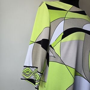 95% polyester, 5% spandex. Bright neon yellow-green, white, black, and grayish beige. Zip closure in back. Geometic retro style dress that screams 70s! Fun and bright. Compare measurements in photos to something similar to ensure fit. Great condition.