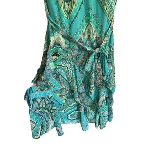 Lovely Y2K bandana teal aqua blue print midi dress by Robbie Bee. Size 10. Features a handkerchief ruffled asymmetrical hem, sleeveless, A-line silhouette, and tie waist bow. Fully lined. Excellent pre-owned condition. Perfect for Y2K, fairy, western, and boho styling.