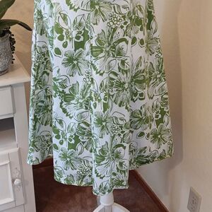 Pretty green floral dress in cool cotton. Fit and flare design. Back zip. Size 14W measures 44 at chest, 40 at waist, 52 at hips, pockets here. 39 long from shoulder to hem. A stylish design with a comfortable fit combine to create the perfect sunny weather dress.