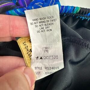 Beautiful glam addition for your swimwear! Upper portion has a beautiful multicolored peacock print ruffles with gold lining, while under the ruffles and rest of swimsuit is solid black.