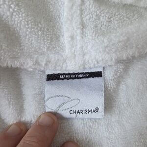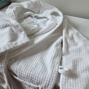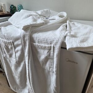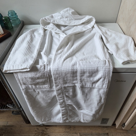 white terry cloth bath robe, doesn't have a specific size.