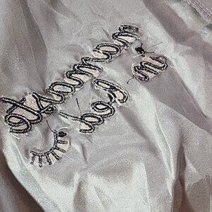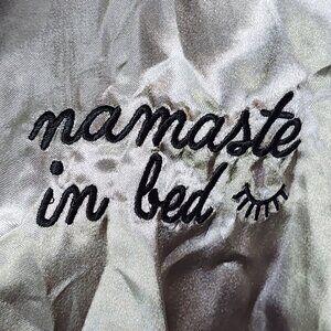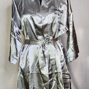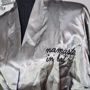 Robe N Hood Grey Silver Poly Namaste In Bed Motif Mid Sleeve Robe with Belt Size OSFM....Stunning Color and super Soft Fabric will Make You Never Wanna Take it Off...Translation Namaste In Bed ... No I'm a Stay in Bed ... for those that don't Meditate lol.....Super Cool....Brand New in Package.....
