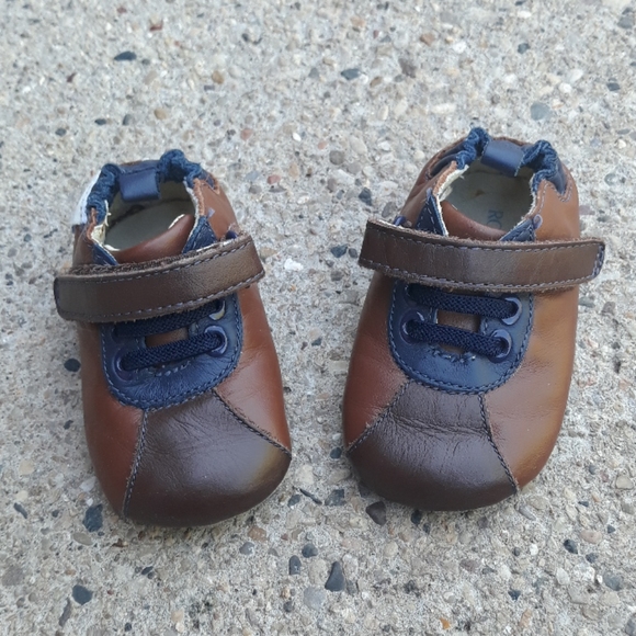 Tan, blue & brown crib shoes