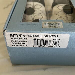 Charming Robeez shoes with floral design. Soft soles for comfort. Ideal for little feet. Little to no signs of wear. Size 6-12 but my little one was able to wear longer.