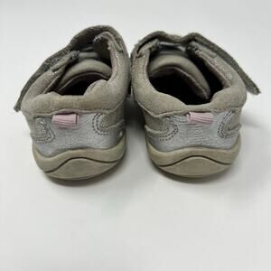 Bundle of good preloved condition baby/toddler shoes. Adorable Robeez gladiator style sandals. Pinkish beige leather with metallic woven in. Fantastic silver Pediped sneakers in size EU 20 (fits us toddler 5) - great for early walkers. hook and loop strap with elastic laces for easy on and off. Please see photos for wear. Lots of life left, but they do show some wear.