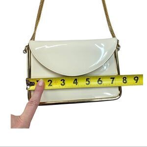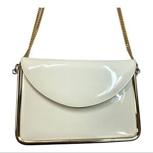 A Robert Bestien ivory patent leather purse with gold tone chain. This is an excellent size evening bag in a color that will go with just about anything. Gold tone hardware frames the bag. Magnetic closure and internal zip pocket. Some very light color transfer in upper back corner (see last photo). Zoom in on photos for more detail and measurements. Evening bag.