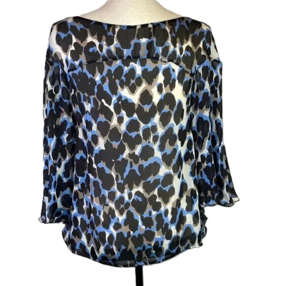 Robert Cavalli Blue Black Leopard Print Silk Blouse Bell Sleeve Sheer Size XS