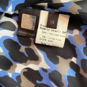 Robert Cavalli Silk Blouse, Size IT 38 (US XS) Bold blue, black, white and taupe abstract leopard print on sheer silk chiffon Flowy silhouette, wide flutter bell sleeves, and a boat neckline that drapes beautifully on the shoulders 3/4 Sleeves - flutter with cut open just below shoulders, exposing arms Fluted Sleeves cascade down to soft ruffled, cut-open sides secured by a tack stitch about 10" above bottom hem Relaxed fit, flowy hem Excellent pre-owned condition Lightweight and luxurious — perfect for pairing with jeans, trousers, or a sleek skirt for a chic, high-end look 100% Silk Dry Clean Approx measurements lying flat: Bust PTP: 15.5" Length from shoulder: 23" 📦 Bundle to save on shipping - 20% discount applied to bundles of 2 items or more 🧼 Smoke and pet-free home 💌 Ships out fast! ❤️New to Poshmark? Get $10 in Posh Credit by entering code MONSEATTLE when you sign up for a new Poshmark account ❤️❤️Thank you for visiting my closet! tags: designer luxury animal print leopard print camo print office work business casual evening party cocktail wedding special occasion date night feminine flowy Italian holiday silk ruffle romantic elegant chic dressy cruise wear timeless fashionable stylish luxurious versatile quality comfortable breezy spring summer fall winter #RobertoCavalli #DesignerBlouse #SilkTop #LeopardPrint #AnimalPrint #BellSleeves #ChiffonBlouse #LuxuryFashion #ItalianDesigner #StatementTop #EveningBlouse #ChicStyle #ResortWear #SheerTop #HighEndFashion